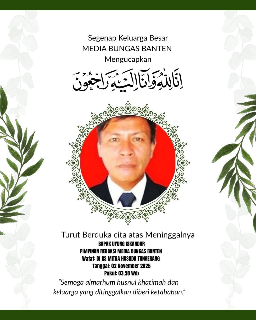 Seluruh staf beserta jajaran media online lenterabanten.com, turut berdukacita yang sedalam-dalamnya. Semoga almarhum Uyung Iskandar diampuni dari segala dosa-dosanya dan diterima amal baiknya. kepada keluarga yang ditinggalkan, semoga diberikan kekuatan dan ketabahan