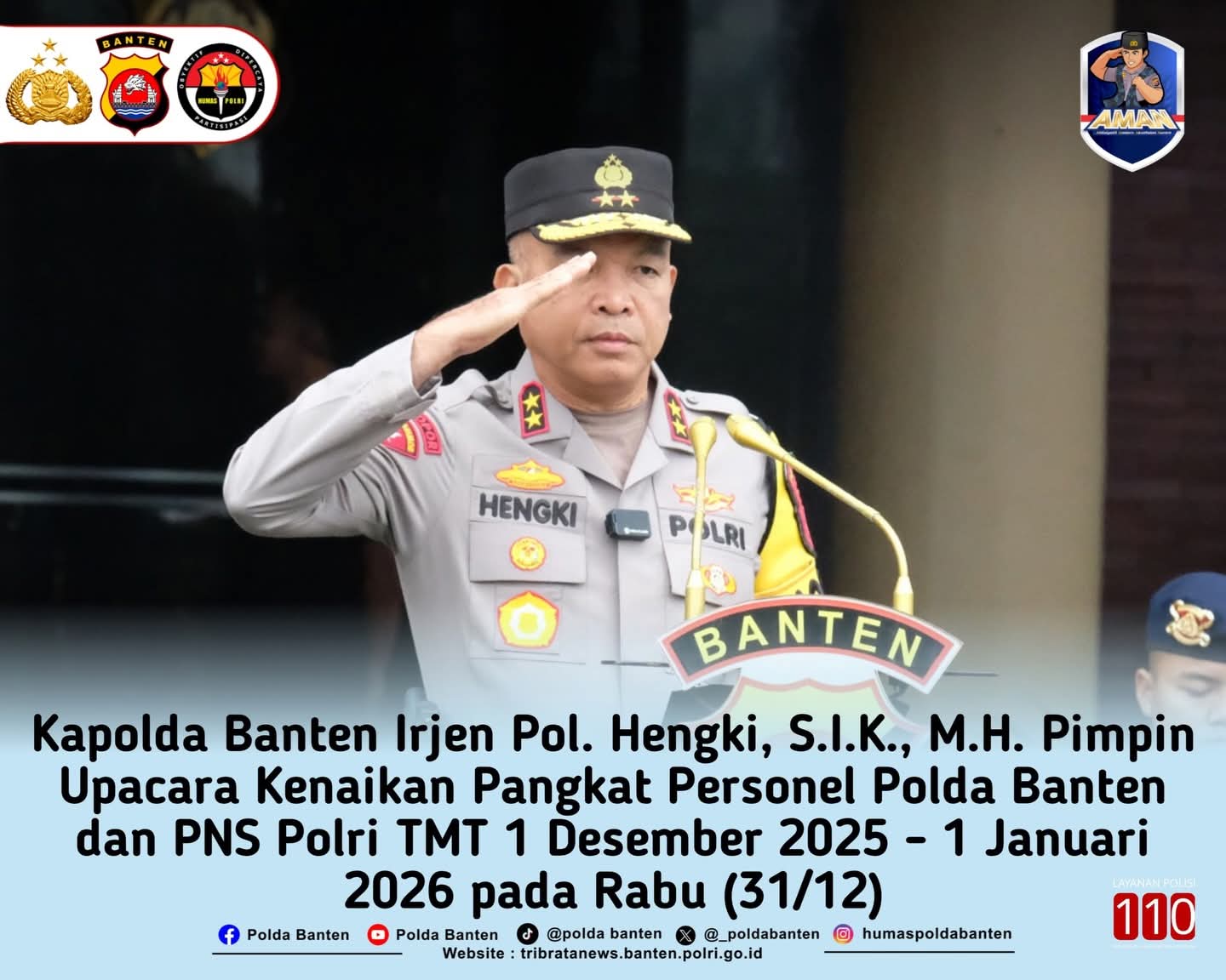 Serang Polda Banten – Kapolda Banten Irjen Pol. Hengki, S.I.K., M.H. secara resmi memimpin upacara kenaikan pangkat bagi personel Polda Banten dan Pegawai Negeri Sipil (PNS) Polri dengan tanggal mulai tugas (TMT) 1 Desember 2025 hingga 1 Januari 2026. Acara yang berlangsung pada hari Rabu (31/12) dilaksanakan dengan ketertiban dan khidmat.