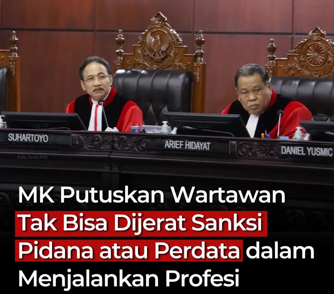 Ketua MK Suhartoyo menyatakan, frasa “perlindungan hukum” dalam Pasal 8 UU Pers bertentangan dengan Undang-Undang Dasar Negara Republik Indonesia Tahun 1945 dan tidak memiliki kekuatan hukum mengikat secara bersyarat. Pasal tersebut harus dimaknai bahwa penerapan sanksi pidana dan/atau perdata terhadap wartawan hanya dapat dilakukan setelah mekanisme hak jawab, hak koreksi, serta penilaian dugaan pelanggaran kode etik jurnalistik melalui Dewan Pers tidak mencapai kesepakatan sebagai bagian dari prinsip restorative justice.