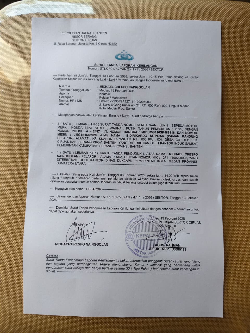 Dalam Laporan yang disampaikan langsung Michael Crespo Nainggolan, dirinya membenarkan telah melaporkan kejadian hilangnya STNK yang terjadi pada Jumat 6 Februari 2026, dengan jenis kendaraan HONDA BEAT STREET warna Putih tahun pembuatan 2025, ber nomor polisi A 2487 IT.